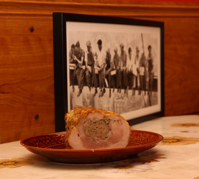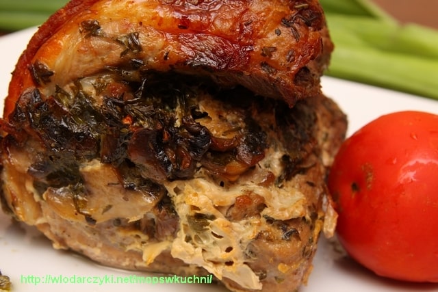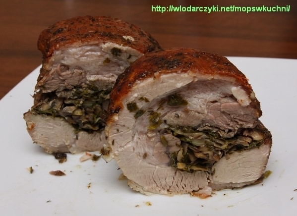 Mój mąż ma teraz urlop, więc mamy czas na wiele rzeczy, na które normalnie tego czasu nie ma. Byliśmy ostatnio na Górniaku (duży rynek w Łodzi) i podczas zakupów na stoisku mięsnym zauważyliśmy roladę z brzuszka. Była tak ładnie zawinięta, opakowana w folię – normalnie aż prosiła się, żeby ją wziąć i upiec. Wzięliśmy więc kilogramowy kawałek. Przyprawiłam ją pieprzem, majerankiem, tymiankiem i zalałam białym octem winnym i oliwą. W takiej marynacie mięso kruszało całą noc. Później okazało się, że kompletnie zapomniałam o soli… no cóż trzeba będzie solić na talerzu…trudno… Następnego dnia zrobiłam farsz ze smażonych pokrojonych w plasterki pieczarek i świeżej natki pietruszki. Aby farsz był zwięzły dodałam jedno jajko. Całość włożyłam w rękaw do pieczenia i piekłam w temperaturze 200 stopni przez 2 godziny. 10 minut przed końcem pieczenia rozcięłam rękaw na górze, aby soki odparowały.