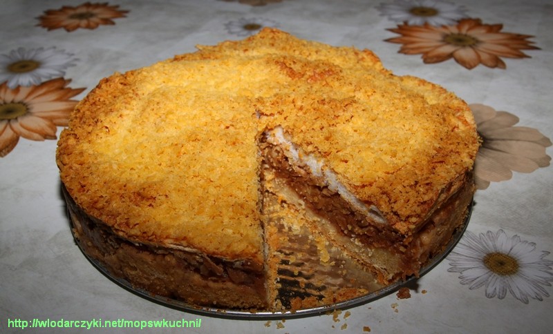 Najlepiej dzień przed pieczeniem przygotowujemy ciasto z 2,5 szklanki mąki, paczki margaryny, 2 łyżeczek proszku do pieczenia, 2 łyżek cukru, 2 łyżek śmietany i 4 żółtek. Wyrobione ciasto dzielimy na dwie części: jedną zamrażamy, a drugą wkładamy do lodówki. Następnego dnia (lub najmniej po dwóch godzinach) wyjmujemy ciasto z lodówki i rozwałkowujemy na placek o grubości około 1 cm. Wykładamy dno wcześniej wysmarowanej tłuszczem i posypanej bułką tartą formy i podpiekamy w piekarniku w temperaturze 160 stopni przez 15 minut. Gdy spód się piecze przygotowujemy wsad owocowy i pianę z białek. Jabłka trzemy na tarce o grubych oczkach, skrapiamy sokiem z cytryny i mieszamy z cynamonem. Bijemy pianę z białek z dodatkiem cukru pudru. Na podpieczony spód wykładamy jabłka, a następnie pianę z białek. Na sam wierzch trzemy zamrożoną połówkę ciasta. Pieczemy ok. 40 minut w temperaturze 160 stopni na środkowej półce piekarnika (grzanie góra-dół).