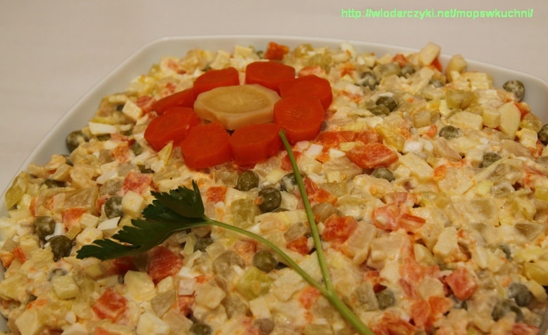 Gotujemy marchewkę, pietruszki i selera. Ja nigdy nie gotuję warzyw specjalnie do sałatki, tylko robię sałatkę przy okazji przygotowania bulionu. A że wczoraj był barszczyk, to warzywka też były 🙂 Oprócz ugotowanych jarzyn potrzebujemy jeszcze ugotować jajka i ziemniaki. Ziemniaki gotujemy w mundurkach i dobrze chłodzimy. Kroimy wszystko w kostkę, siekamy bardzo drobno kawałek białej części świeżego pora. Pamiętajmy zawsze o obraniu ogórków ze skórki – sałatka będzie wówczas bardziej lekkostrawna. Groszek konserwowy nie jest koniecznym składnikiem. Doprawiamy całość solą i pieprzem i mieszamy z majonezem.