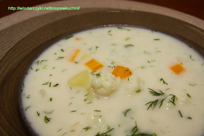 Najpierw przygotowujemy bulion. Apeluję – nie używajcie gotowych kostek bulionowych – toż to trucizna! Ja jak zwykle miałam troszkę zamrożonego bulionu drobiowo-warzywnego. Kroimy ziemniaki w kostkę, kalafiora na małe kawałki, marchewkę w kostkę. Gotujemy około 25 minut. Doprawiamy solą, pieprzem i majerankiem. Zabielamy śmietaną rozrobioną z 2 łyżkami mąki. Drobno posiekany koperek wsypujemy już po zdjęciu zupy z palnika. Dokładnie mieszamy i rozlewamy na talerze.