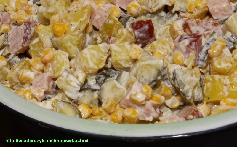 Ziemniaki gotujemy około 12 minut – tak aby nie były już surowe, ale żeby nie rozpadały się. Czekamy aż ostygną i kroimy w dużą kostkę. Dodajemy pokrojone ogórki małosolne, boczek i kukurydzę odsączoną z zalewy. Posypujemy sporą ilością pieprzu. Mieszamy z 2 łyżkami majonezu. Gotowe!