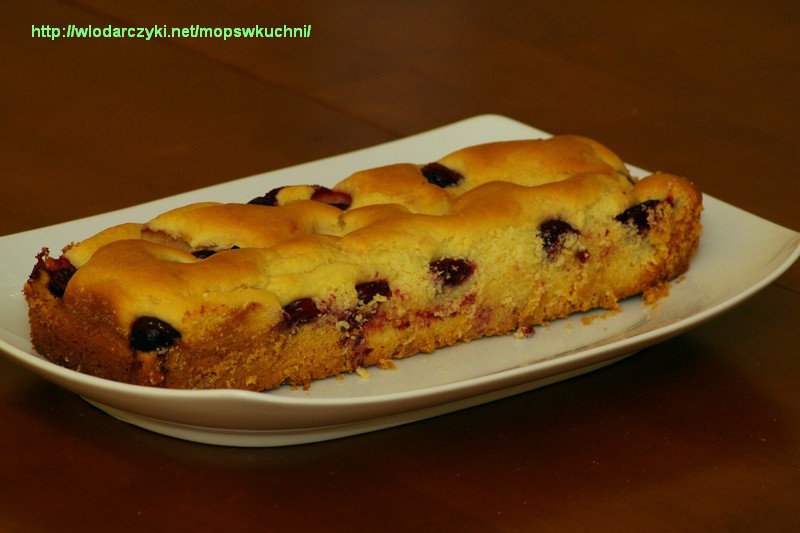 Całkiem niedawno upiekłam placek drożdżowy z jagodami. Wyszedł mi bardzo smaczny, więc postanowiłam ponownie zrobić to ciasto, ale tym razem z innymi owocami. Ostatnio teściowa podarowała mi drylownicę do wiśni, więc pomysł na dodatek nasunął się sam 🙂 Jednak postanowiłam zrobić ciasto w małej foremce – bo mieliśmy je zjeść tylko ja i mąż. Zmieniłam proporcje składników i dla formy 30 x 10 cm wyglądają one mniej więcej tak.