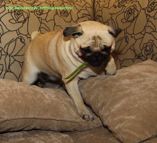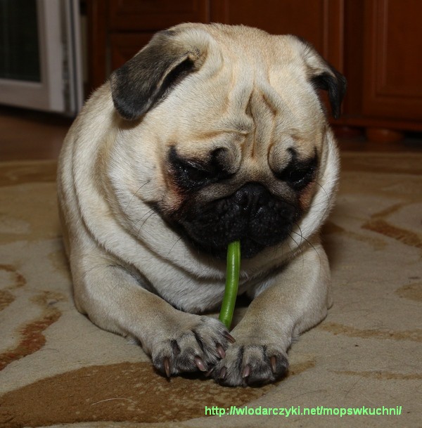 Później długi czas ciamkała ją na dywanie. Moja wege-mopsia, hihi.