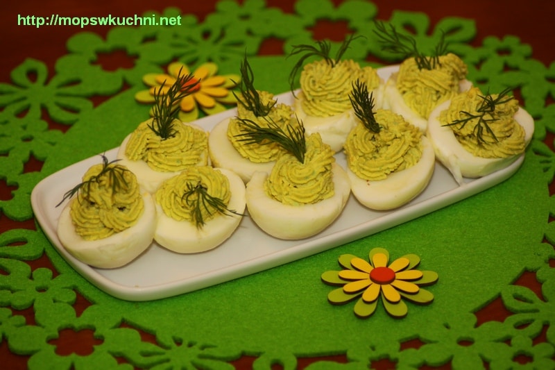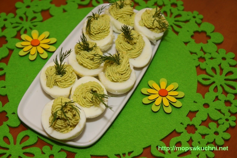 Jakiś czas temu na moim profilu na Facebook-u zapytałam się Was, jaką potrawę wielkanocną chcielibyście zobaczyć na moim blogu. Otrzymałam jedną odpowiedź: jajka faszerowane, ale koniecznie na ostro! Spełniam zatem prośbę Cherryblossomgirl – proponuję jajka faszerowane pastą z wasabi. Przy okazji zapraszam tych, którzy jeszcze tego nie zrobili do polubienia Mopsa w kuchni na FB.