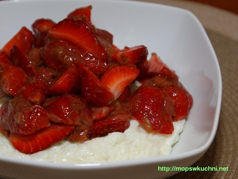 4. Do miseczek nakładamy porcje ryżu i rabarbaru z truskawkami.
