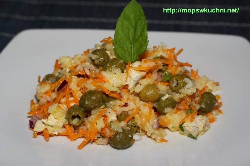 Ryż łączymy z kurczakiem, marchewką, oliwkami i dymką. Mieszamy składniki dressingu, zalewamy nim sałatkę.