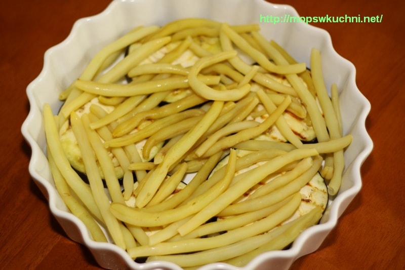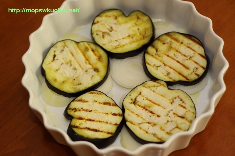 5. Dno naczynia żaroodpornego smarujemy oliwą, wykładamy krążkami cebuli, na nich układamy pierwszą warstwę z bakłażana i całość fasolki.