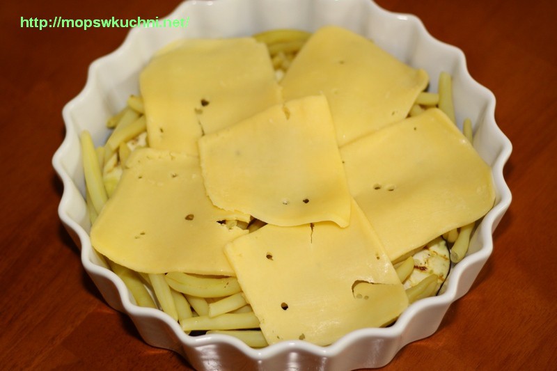 8. Ostatnią warstwę tworzy ser żółty, na którym układamy plastry czuszki. Posypujemy zapiekankę majerankiem.