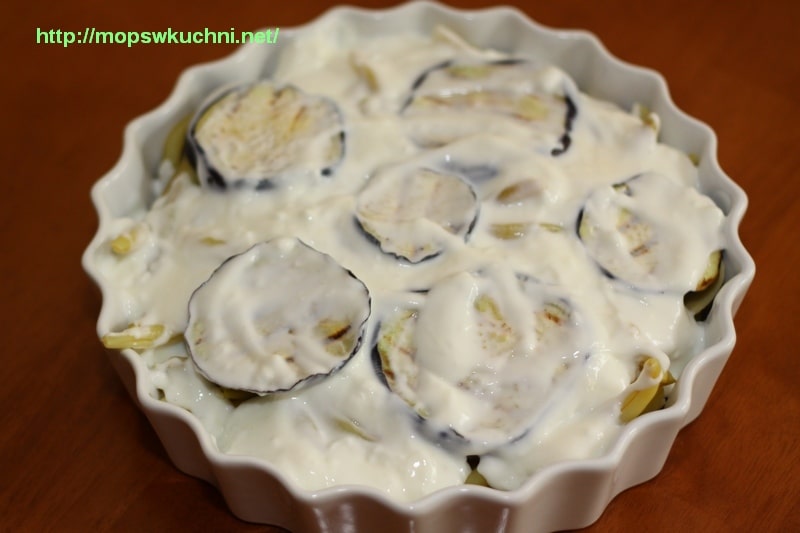 7. Na serze układamy plastry bakłażana. Całość polewamy jogurtem naturalnym, posypujemy czarnym pieprzem mielonym.