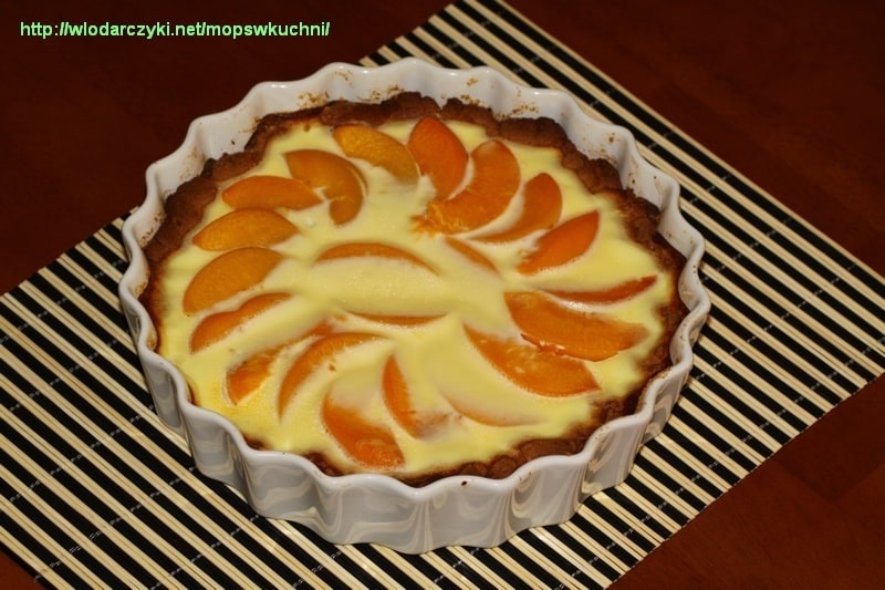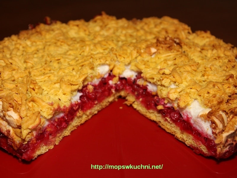 1. Składniki ciasta szybko zagniatamy i wykładamy nim dno okrągłej formy 26 cm. Ciasto nie da się zagnieść w kulę, jest to ciasto kruche.W przepisie jest podane, aby wstawić je na 30 minut do lodówki, ja nie wykonałam tego kroku.