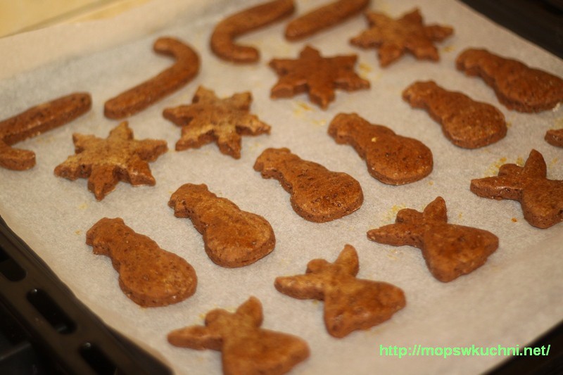 Składniki mieszamy, wyrabiamy gładkie ciasto. Wykładamy na stolnicę posypaną mąką i rozwałkowujemy na grubość ok. 4 mm. Wykrawamy pierniczki o pożądanych kształtach. U mnie były: aniołki, bałwanki, gwiazdki śniegowe, laski oraz piernikowe ludki.