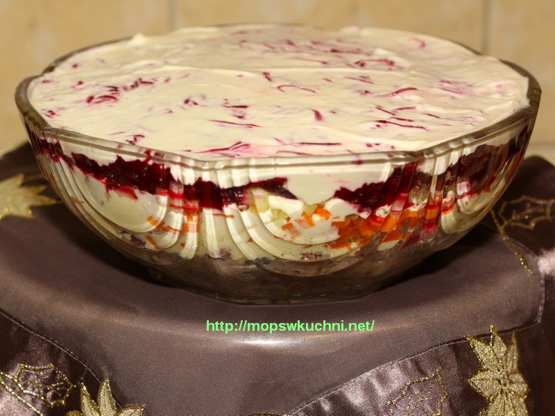Warzywa gotujemy w mundurkach do miękkości. Studzimy. Obieramy, marchewkę i ziemniaki kroimy w drobną kostkę. Śledzie osączamy z zalewy, kroimy w kostkę. Wkładamy do salaterki, posypujemy posiekaną w kostkę cebulą, odrobinę solimy i pieprzymy. Smarujemy cienką warstwą majonezu. Posypujemy marchewką, solimy, pieprzymy, smarujemy majonezem, teraz warstwa z ziemniaków, sól, pieprz, majonez, starte na tarce buraki, sól, pieprz, majonez. Wstawiamy na kilka godzin do lodówki.”
