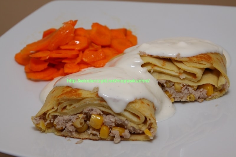 Zaczynamy od ugotowania mięsa z włoszczyzną i przyprawami. Powstały bulion możemy wykorzystać do przygotowania jakiejś zupy 🙂 Gdy mięso się gotuje (około 40 minut), możemy usmażyć naleśniki. Ciasto robimy w malakserze. Najpierw wlewamy mleko, później wbijamy jajka, a na końcu dodajemy mąkę i szczyptę soli. Mieszamy. Mąki dodajemy tyle, aby wyszła odpowiednia konsystencja. Smażymy naleśniki. Ugotowane mięso oddzielamy od kości i miksujemy przez dosłownie 10-20 sekund w malakserze razem z ugotowanymi korzeniami pietruszki. Chodzi o to, aby nie wyszła miazga 😉 Do farszu dorzucamy kukurydzę z puszki i mieszamy łyżką. Zawijamy farsz w przygotowane wcześniej naleśniki i podsmażamy na patelni. Podajemy z sosem czosnkowym i surówką z marchewki (krążki marchewki moczone przez co najmniej godzinę w białym occie winnym i oliwie z oliwek, z dodatkiem łyżeczki cukru.