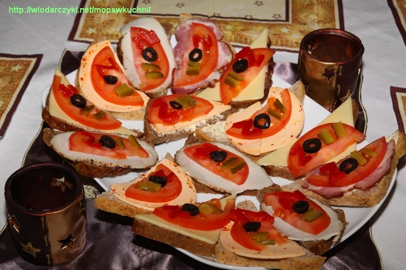 Najpierw były zimne przekąski – głównie rybki. Śledziki: śledzie korzenne przywiezione przez rodziców Jacka oraz moje śledziki pod pierzynką, na które przepis już kiedyś zamieszczałam na blogu. Ale podałam je na pięknym platerze w kształcie rybki, więc pozwalam sobie zamieścić jeszcze jedne ich zdjęcie 🙂