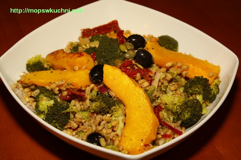 2. Gotujemy brokuły w osolonej wodzie, odcedzamy, przelewamy zimną wodą, odsączamy i czekamy aż ostygną. Dodajemy do pozostałych składników i kaszy i dobrze mieszamy. Taką sałatkę możemy przechowywać w lodówce ok. 3 dni.