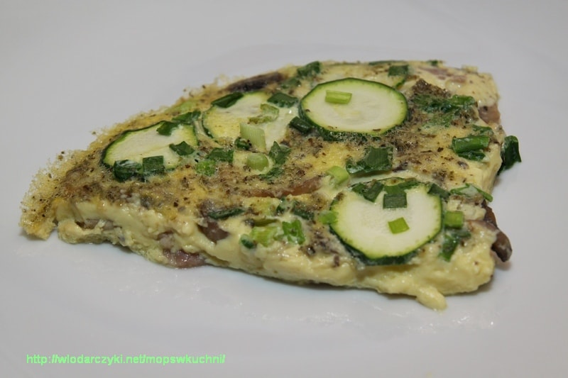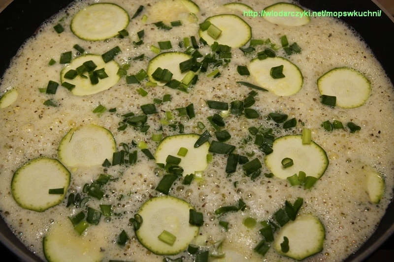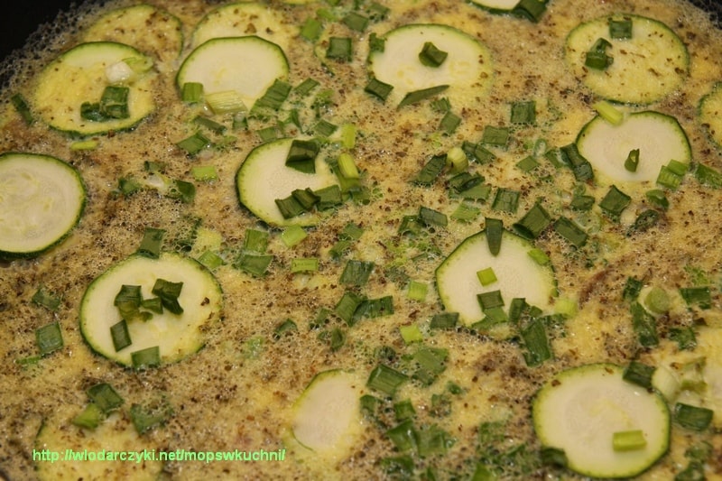 Jajka mieszamy z mlekiem za pomocą miksera. Dodajemy szczyptę soli, dzięki czemu powstała masa będzie bardzo puszysta i nie opadnie 🙂 Dodajemy także pieprz i majeranek. Na patelni podsmażamy pokrojone w plasterki pieczarki i szynkę. Wylewamy masę mleczno-jajeczną. Na wierzchu układamy plasterki cukinii i posypujemy całość szczypiorkiem.