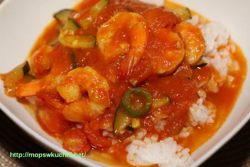Czosnek drobno siekamy. Cukinię kroimy w paski, chili oczyszczamy z nasion i kroimy w krążki. Na rozgrzanym w woku oleju smażmy czosnek i cukinię. Po 5 minutach dodajemy papryczkę chili, przyprawy i pomidory z puszki. Gotujemy pod przykryciem kolejne 5 minut, tak aby sos zgęstniał. Odkrywamy i dodajemy krewetki, sok z limonki oraz sól. Trzymamy na ogniu jeszcze 5 minut. Na końcu dodajemy posiekaną kolendrę (natkę). Ja zapomniałam o niej na śmierć 😉