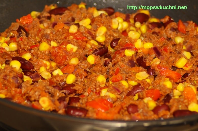 Smażymy naleśniki. I zaraz zabieramy się za farsz. Jeśli mamy wołowinę mieloną smażymy ją na patelni. Ja miałam gotowaną, więc zmieliłam ją w malakserze. Podsmażamy drobno pokrojoną cebulę i słodką paprykę. Mieszamy z mięsem. Dodajemy kukurydzę (u mnie gotowaną 10 minut), fasolę, pokrojone w kostkę pomidory bez skórki oraz 3 łyżki koncentratu. Zamiast tych dwóch składników można użyć pomidorów krojonych z puszki. Na samym końcu dodajemy zmiksowaną lub bardzo drobno posiekaną papryczkę chilli i przeciśnięty przez praskę ząbek czosnku. Całość mieszamy zagotowujemy.