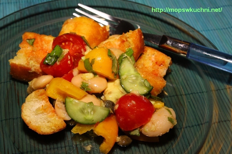 W tej wersji panzanelli lista składników jest wyjątkowo długa. Trzeba też przyznać, że sałatka nie należy do najtańszych. O tej porze roku ciężko jest też dostać awokado w rozsądnej cenie. Mimo wszystko jednak warto przygotować panzanellę w tej postaci, albowiem jej smak jest nieziemsko dobry.