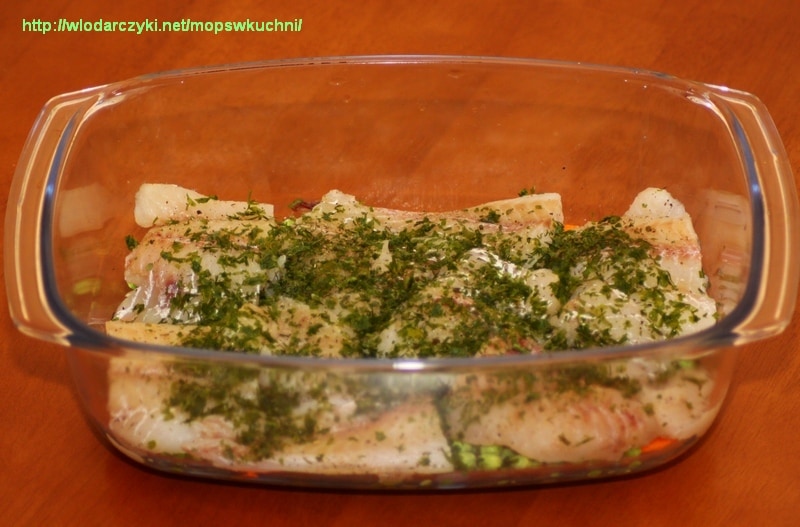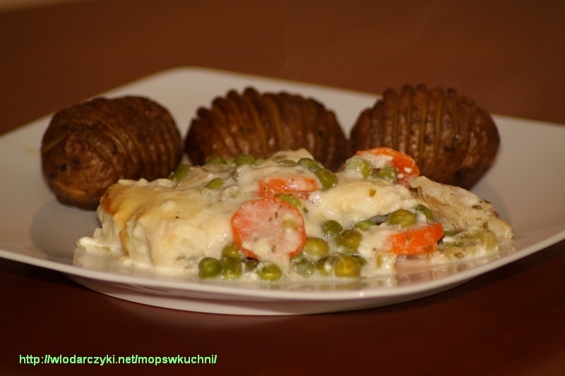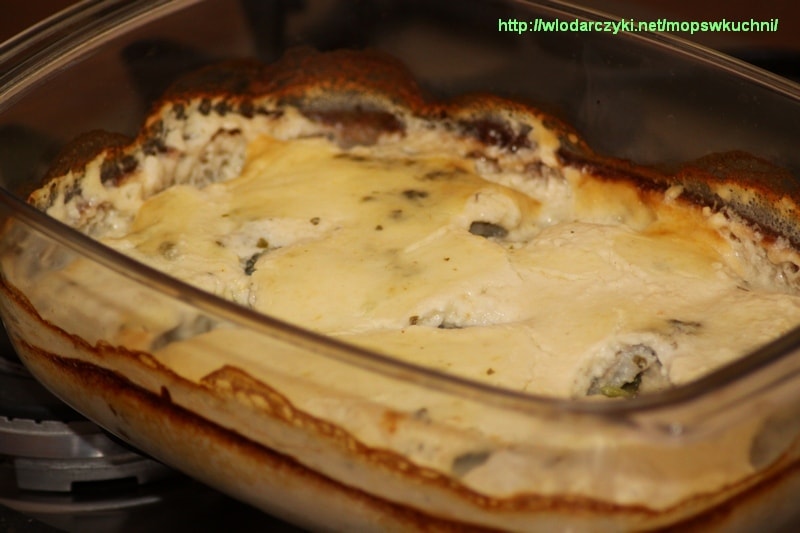 Kładziemy na nich pokrojone matjasy, cebulę i zalewamy śmietaną zmieszaną z pieprzem i łyżeczką cukru.