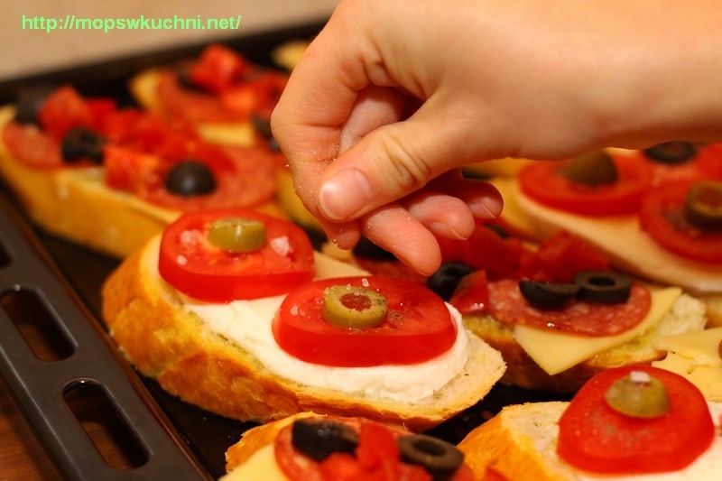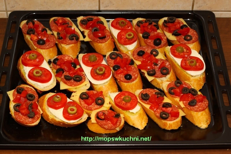 Bagietkę lub ciabattę kroimy w plastry. Mieszamy oliwę z przeciśniętym przez praskę czosnkiem i smarujemy nią kromki z obydwu stron. Układamy na blasze do pieczenia. Na części grzanek układamy plastry mozzarelli, na II części – ser żółty. Na mozzarelli kładziemy cienko pokrojone pomidorki oraz zielone oliwki. Posypujemy solą morską.